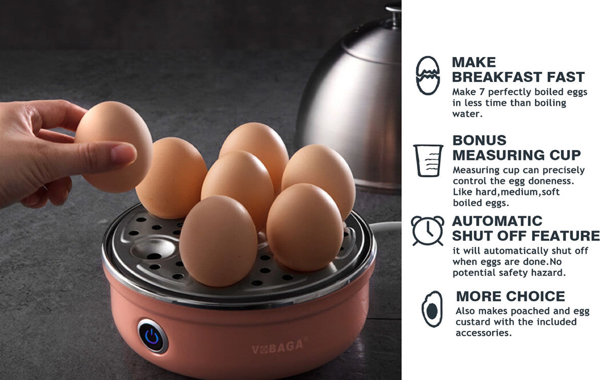 Now you can enjoy your eggs the way you want them. No more cooking accidents. With this smart VOBAGA egg cooker, your eggs are always going to be perfect. You can use this egg poacher maker to cook, Make 7 hard, medium, and soft boiled eggs, individual egg custard, 2 poached eggs!